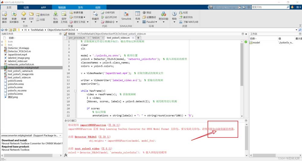 事情是这样的,当我们运行一个需要附加功能包支持的程序,如我下面的这个需要“Deep Learning Toolbox Converter for ONNX Model Format”这个工具,但没有安装过这个功能,这时会提示如下错误。这在之前我们点击箭头处的按钮,就会弹出附加功能管理器并直接进入安装界面,但这次由于mathwork的更新会检查是不是正版,这时会出现上图的问题。