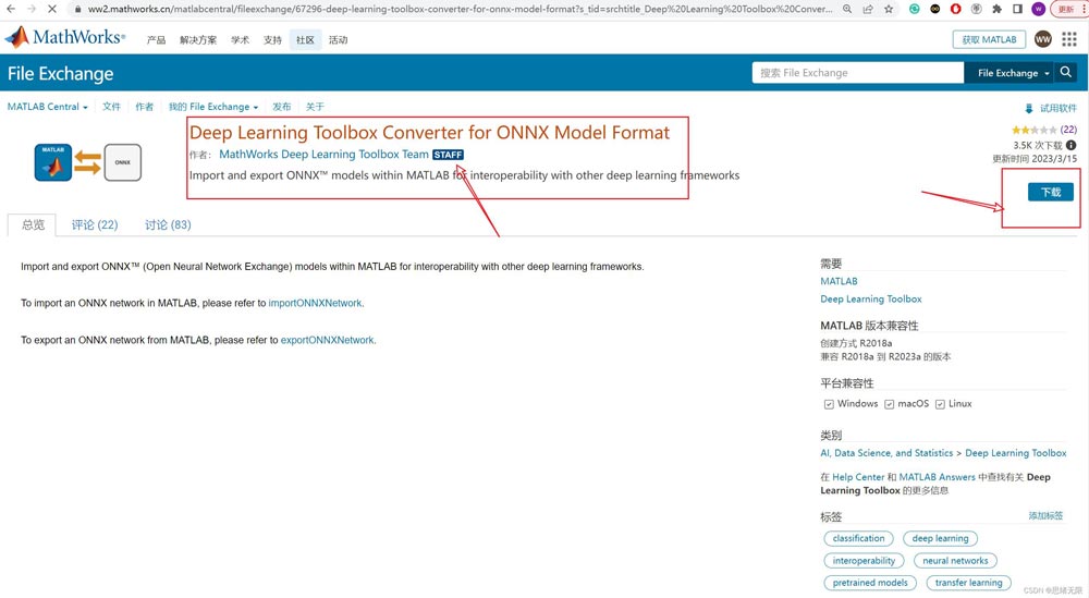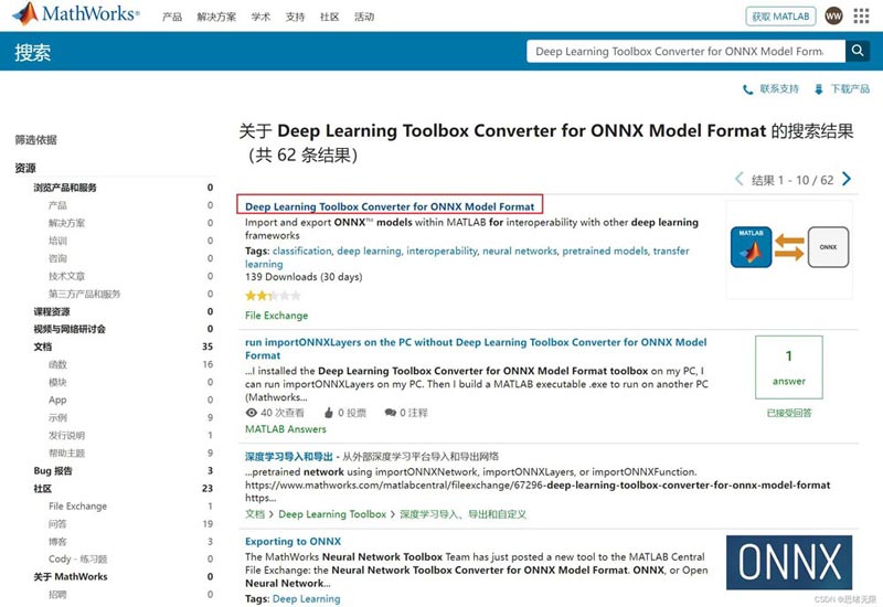 (1)首先我们需要在官网上搜索找到需要安装的工具的名字,在这个例子中,我们需要的是“Deep Learning Toolbox Converter for ONNX Model Format”这个工具,因此复制名称到官网https://ww2.mathworks.cn/。如下图所示,输入要安装的工具名称,然后点击搜索。