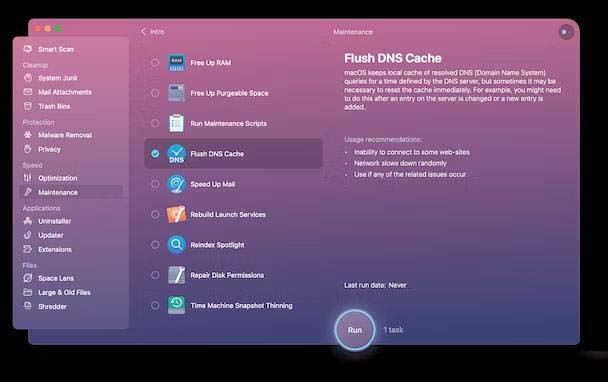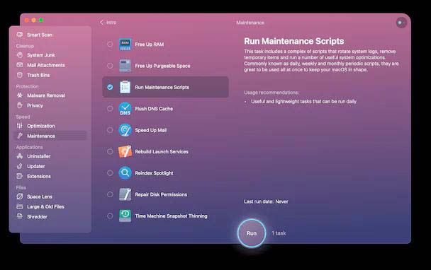 调整Mac速度的工具是“运行维护脚本”。这可以恢复系统库中开始变慢的部分。试着运行它,看看你的Mac是否反应更灵敏。作为额外的改进,在同一个应用程序中刷新DNS缓存。当你的网络无故变慢时,它会有所帮助。