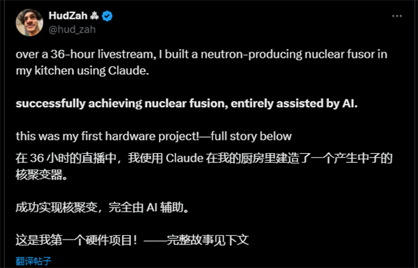 该男子化名Hudzah在其Substack上分享了实验过程,实验的目标是建造一个能够分裂原子并产生等离子体的聚变器。