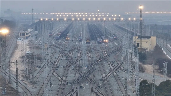 据悉,这一场景发生在陕西省西安市临潼区新丰镇境内的新丰镇站,一列列编组完成的货运列车满载民生物资,驶出新丰镇编组站六场。