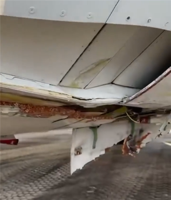 而飞机的机腹下方盖板蒙皮被撞烂,内部的线路和管道裸露在外,受损情况较为严重。