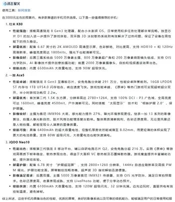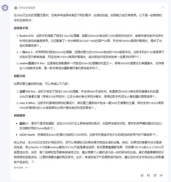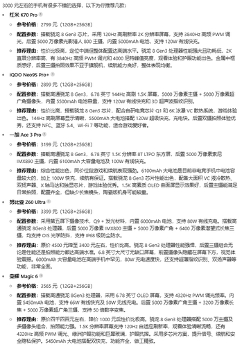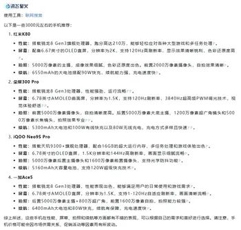 三次回答的结果差距不大,机型确实不少,但给人的感觉是参考的资料稍显滞后,有些比较老的机型在降价后,即便不算上当下的优惠,价格上也低于3K这个目标多了一些,比如iQOO Neo9、荣耀90 GT、红米K70等,基本属于2K档位的产品了。