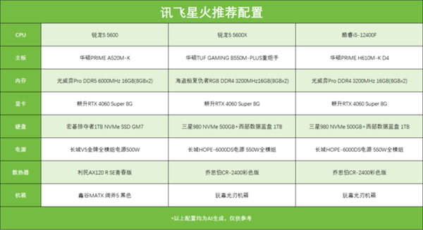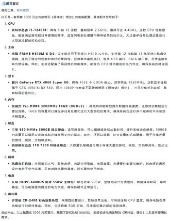 讯飞星火给出了三套不同的配置组合,咋一看起来都比较合理,也都给出了比较详细的选择理由,但仔细一看就会发现存在一些明显的错误,比如第一套中的内存就有问题,华硕PRIME A520M-K并不支持DDR5内存;而且三套都推荐了RTX 4060 Super显卡,这款英伟达自己都不知道曾发布的显卡,仔细看下推荐的理由,大概能猜到它应该想推荐的是4060 Ti...