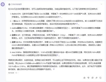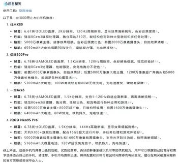 讯飞星火是几款大模型中给出答案最少的,算是“沉默寡言”了,不过推荐的机型都比较符合条件,而且给出了较为详细的产品亮点介绍,但同样和装机时一样,出现了一些错误,比如第一遍回答中一加Ace?5它写的搭载了骁龙8 Gen 3至尊版...这就属于把知识学杂了,创造了一款并不存在处理器,还有K80后置并没有200万像素的微距,它的前代K70有这颗镜头,出现了一些细节上的小问题。