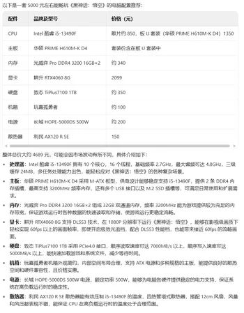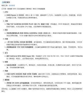 首先来看看电脑装机,我给出的问题是“预算5000,帮我装一台能畅玩《黑神话:悟空》的电脑,给出配件具体的型号”,我们来依次看答案。第一个是DeepSeek(深度思考,联网搜索),三次的回答如下: