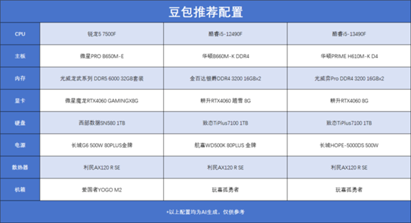 豆包这边三次提问分别给出了三套配置,一套AMD平台的以及两套英特尔平台的,整体都是比较合理的,每个配件都给出了选择的理由,而且和DeepSeek一样,还有相关配件的参考价格(价格存在波动,仅供参考),表现还是不错的。
