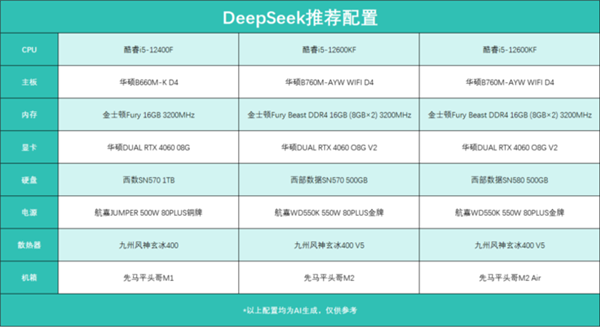就我的测试结果来看,这五款AI大模型中,DeepSeek的表现应该是最好的,配置比较合理,给出了对应的推荐理由,而且还有参考价格以及配置优化方向和购买建议,是回答的最全面的一个;豆包的表现其实也不错,给出了三套不同的配置,英特尔和AMD的都有,也都比较合理,而且同样有参考价格;其它三款则各自有着较为明显的问题,比如配件型号错误或配件缺失等。