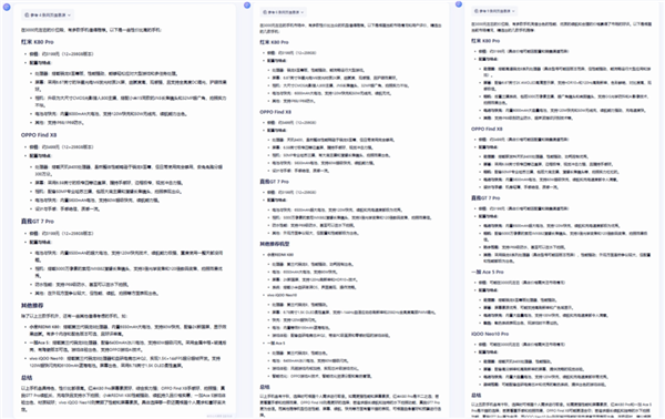 虽然在装机那块表现一般,但手机选购这块的实现了逆转,尽管重复率比较高,但推荐的机型基本都符合设置的条件,也给出了产品的配置和特点,并且列出了推荐的版本和价格,具有不错的参考价值。不过第三次回答中还是出现了一点点错误,红米K80 Pro确实是三摄没问题,但应该是主摄+广角+长焦,而非主摄+广角+微距。