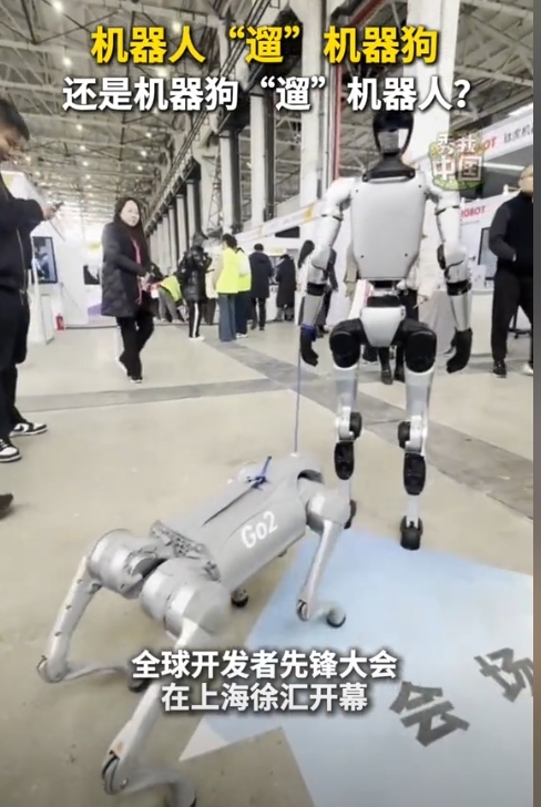 这款人形机器人不仅展示了跑步等动作,还拿起绳子遛起了自家机器狗。这一魔幻场景,引来大批观众驻足拍照、围观。
