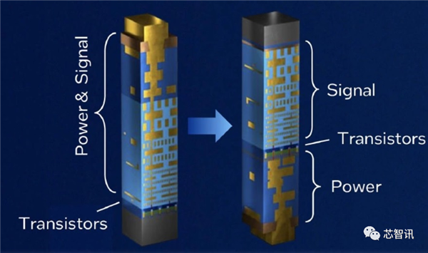 Intel代工厂的业界首创 PowerVia 技术将间距较大的金属和凸块重新定位到芯片背面,并在每个标准单元中嵌入纳米级硅通孔 (nano-TSV),以实现高效的电源分配。