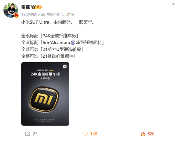 小米SU7 Ultra全系标配24K金碳纤维车标、5m²Alcantara超细纤维面料;全系可选21英寸U型锻造轮毂、21处碳纤维部件。