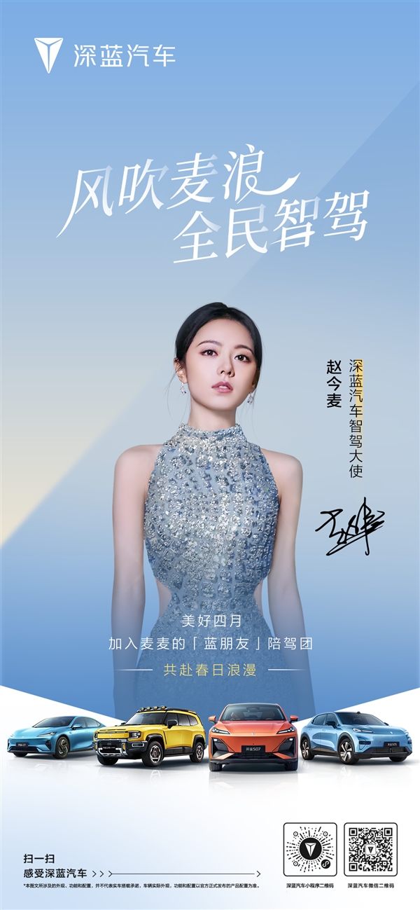 在宣传片中,赵今麦透露了自己参与深蓝汽车的一个活动:即日起,凡到深蓝汽车全国门店试驾,就有机会解锁「麦麦副驾体验卡」,成为10人陪驾团成员,和赵今麦一起智驾启航,邂逅浪漫春光!