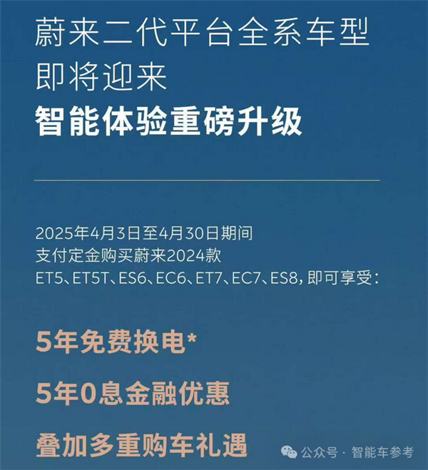 最新促销动作显示,现在购买蔚来车型,不仅5年0息优惠,还推出了5年免费换电。