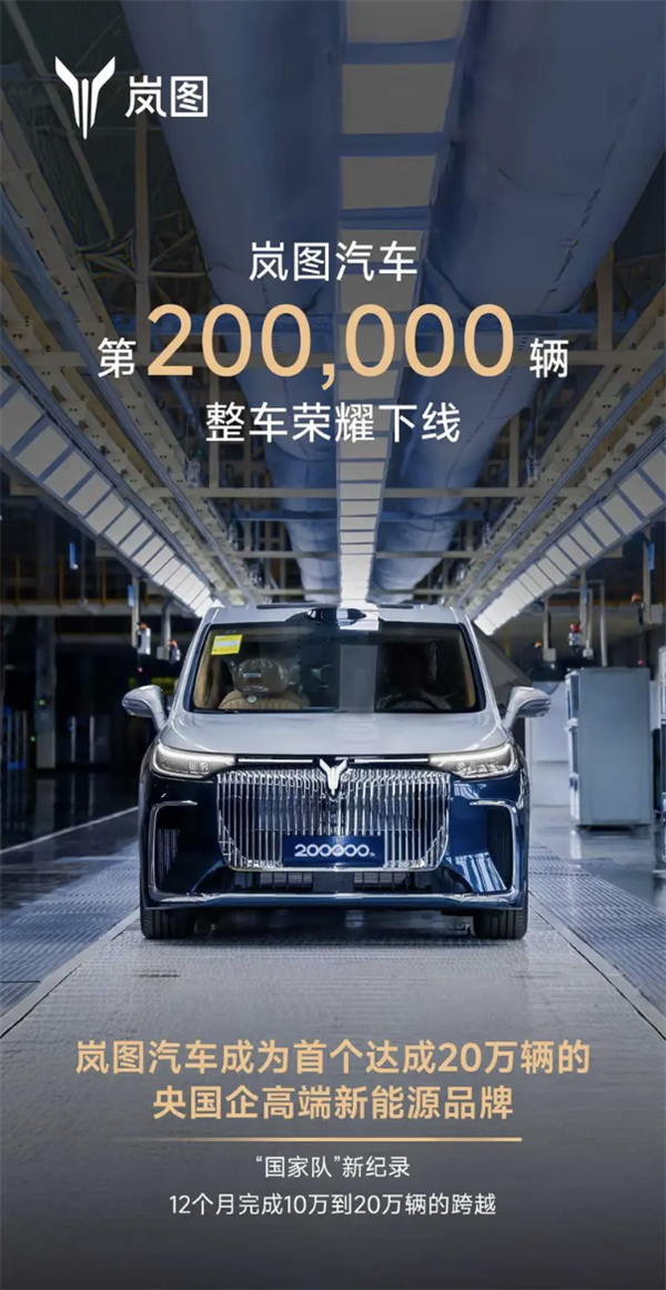 从第1辆到第20万辆,用时37个月,从10万辆到20万辆仅用12个月,创下新纪录,成为首个达成20万辆的央国企高端新能源品牌。
