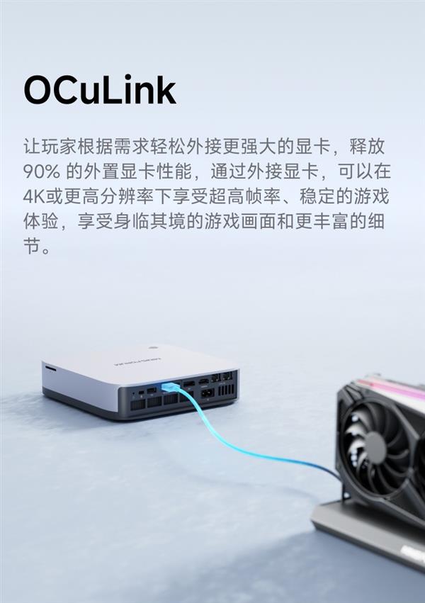 此外,主机还配备有一个OCuLink接口,支持连接外部独立显卡,可根据需求轻松外接更强大的性能显卡,如NVIDIA RTX系列或AMD Radeon RX系列,轻松满足2K/4K分辨率下的大型3A游戏需求。