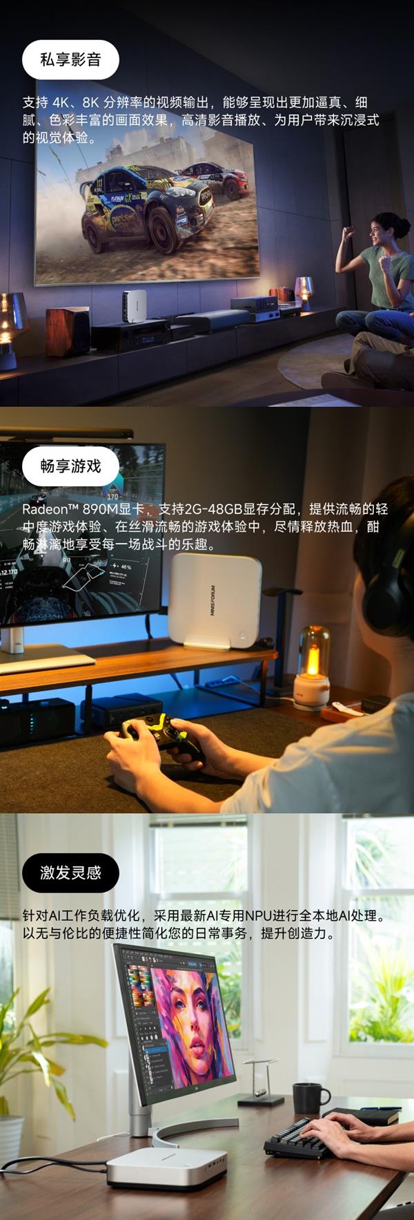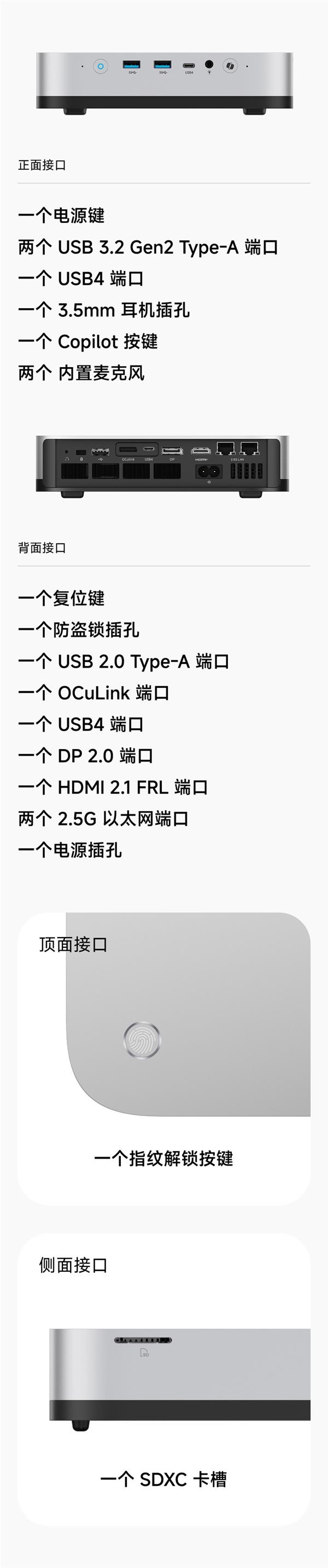 其他方面,这款产品支持四屏4K,可提供 双2.5G 网口、HDMI 2.1、DP 2.0、USB-C 等接口,支持 Wi-Fi 7 和蓝牙5.4,预装 Win11 系统。