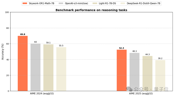 此外,数学专项模型Skywork-OR1-Math-7B在AIME24/25的表现远超当前主流7B级模型,甚至接近蒸馏版Deepseek-32B模型同等水平(DeepSeek-R1-Distill-Qwen-32B)。