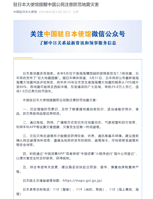 电脑知识网4月14日消息,4月14日,中国驻日本大使馆官方发文,提醒中国公民注意防范地震灾害。