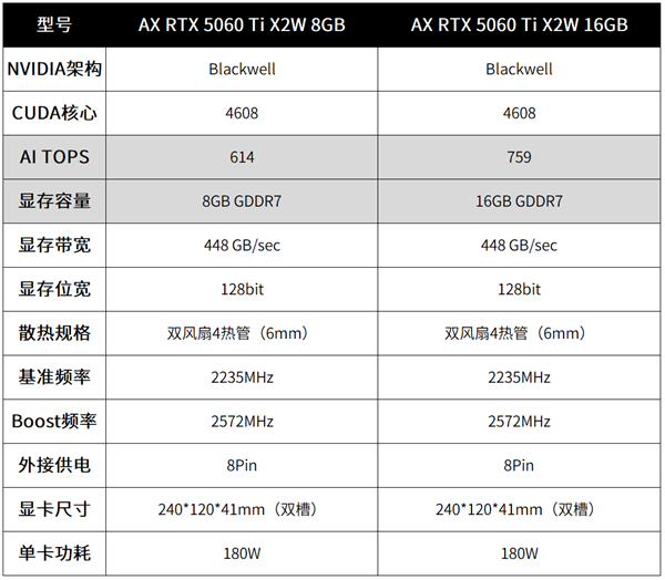 AX电竞叛客RTX 5060 Ti X2W 8GB / 16GB显卡有着纯白涂鸦的时尚外观造型,基于最新的NVIDIA Blackwell架构所打造,带有4608个CUDA核心。配备了GDDR7三星高速显存以及128bit的位宽,显存带宽有着448GB/s的速率。8GB版本AI TOPS达614,16GB版本AI TOPS则来到759。基准频率和Boost频率分别为2235MHz和2572MHz。