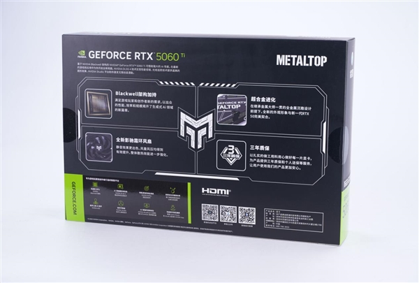 来到外盒背面,可以看到金属大师系列的亮点简介,包括了全新Blackwell架构GPU芯片、外观形象升级、二代霜环风扇和3年质保承诺。
