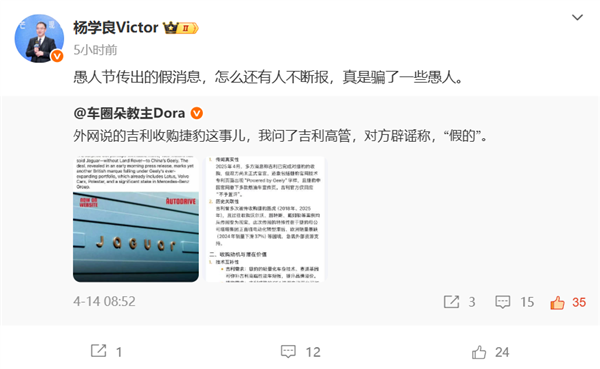 电脑知识网4月17日消息,吉利控股集团副总裁杨学良今日发文辟谣吉利收购捷豹一事,称这是“愚人节传出的假消息,怎么还有人不断报,真是骗了一些愚人。”