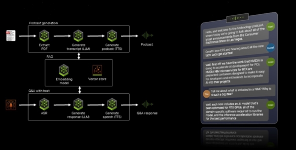 用户仅需下载对应功能的NIM应用(如PDF转播客问答用【PDF To Podcast】、人声修复用【StudioVoice】),即可快速调用AI模型。