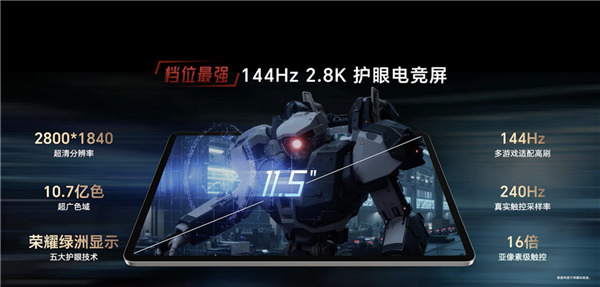正面搭载11.5英寸LCD电竞屏,拥有2.8K超清分辨率,支持最高144Hz的八档刷新率,最高240Hz真实触控采样率和16倍亚像素级触控。