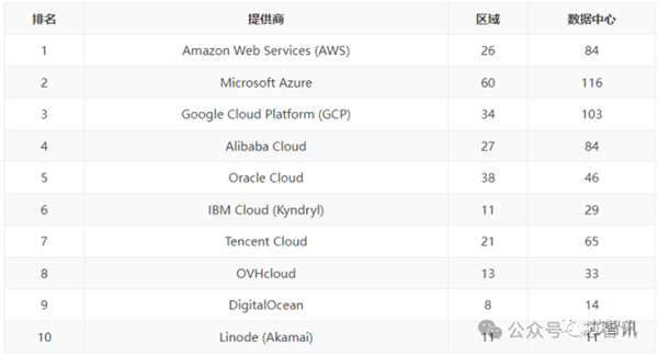 据另一家研究机构Dgtl Infra最新统计显示,2023年全球排名前10的云服务提供商分别是:Amazon Web Services、微软Azure、谷歌云、阿里云、甲骨文云、IBM云(Kyndryl)、腾讯云、OVHcloud、DigitalOcean和Linode(隶属于Akamai)。