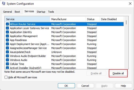 步骤 2.导航到系统配置 > 服务 > 选中隐藏所有 Microsoft 服务复选框 > 全部禁用。