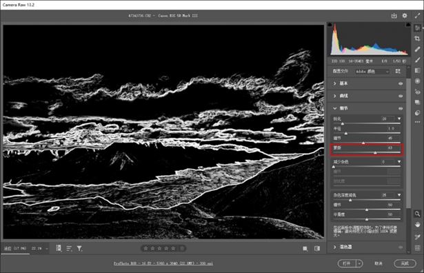 “细节”控制画面中锐化的具体范围,“细节”数值越大,就会有更多的细微边缘被锐化,也就是说如果我们想要“纤毫毕现”,突出各种细节纹理,那么就需要使用较高的数值,反之则可以适当使用小一些的数值。