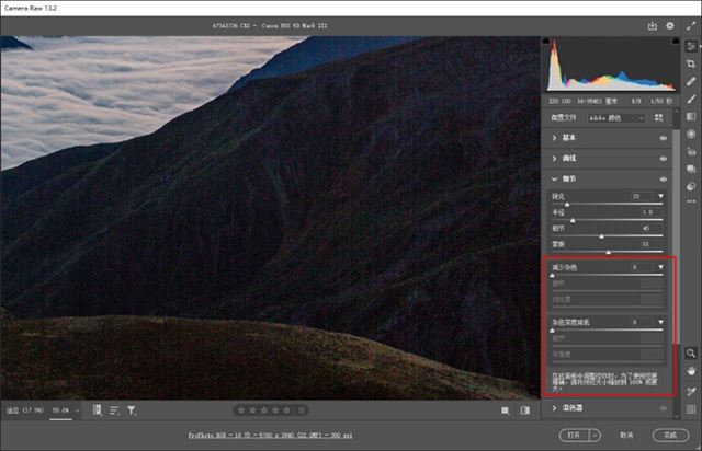 “杂色深度减低”主要用于消除照片当中彩色的噪点,它与“减少杂色”不同,“减少杂色”用于消除单色的噪点,而“杂色深度减低”则用于消除彩色的噪点。可以看到,提高“杂色深度减低”之后,画面当中的彩色噪点得到了消除。