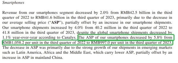 财报显示, 2022 年 Q3 ,小米手机的 ASP (平均售价 )为 1058.2 元,但 2023 年 Q3 的 ASP 又降到了 997 元。