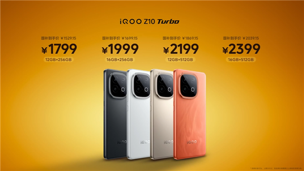 iQOO Z10 Turbo 12GB+256GB售价1799元、16GB+256GB售价1999元、12GB+512GB售价2199元、16GB+512GB售价2399元,国补后到手价1529.15元起。