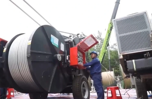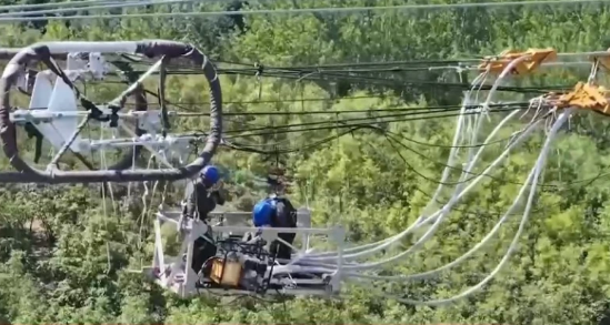 随着现场指令发出,一根重达10吨的输电导线被缓缓拉起,经过3个小时作业后,导线安全跨过1000千伏长南线,标志着继陕武线、豫阳线之后,成功完成全部三条特高压线路跨越任务。