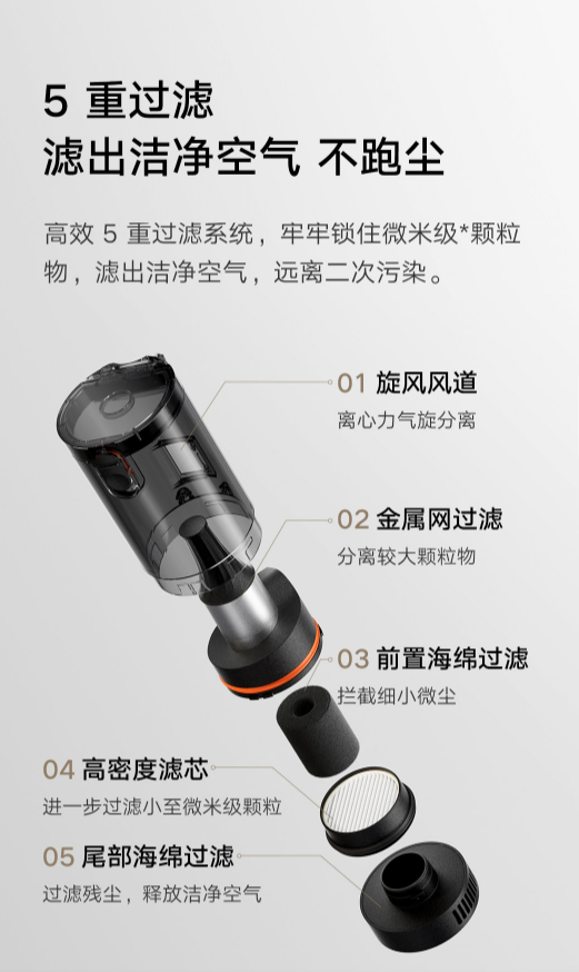 米家车载吸尘器拥有高效5重过滤系统,分别是旋风风道、金属网过滤、前置海绵过滤、高密度滤芯、尾部海绵过滤。