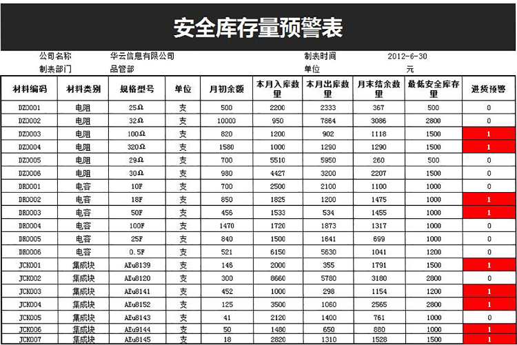 电脑知识网提供个性化安全库存量预警表系统下载,模板编号为1905220,大小为14.69KB,作品在2019-07-08上传到电脑知识网,作品高清大图模板,格式为xlsx,属于仓储购销高清模板,作品模板源文件下载后可用编辑替换,模板中如有人物画像仅供参考禁止商用。