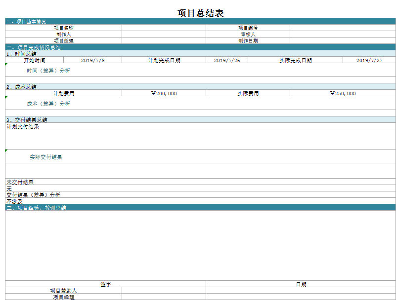 项目总结表excel模板