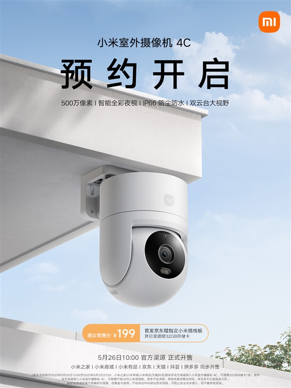 电脑知识网5月24日消息,小米最新推出了小米室外摄像机4C,目前已经开启预约,将于5月26日早10点正式开售,建议零售价199元。
