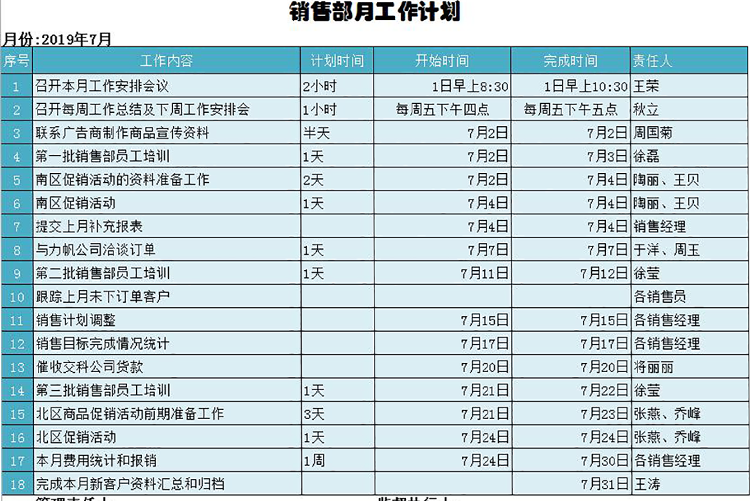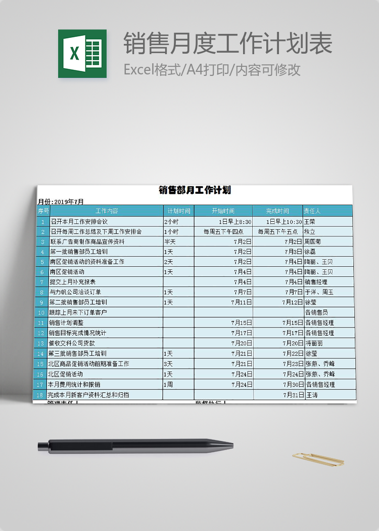电脑知识网提供个性化蓝色系销售部月度工作计划表下载,模板编号为1905304,大小为14.22KB,作品在2019-07-09上传到电脑知识网,作品高清大图模板,格式为xlsx,属于日常生活高清模板,作品模板源文件下载后可用编辑替换,模板中如有人物画像仅供参考禁止商用。