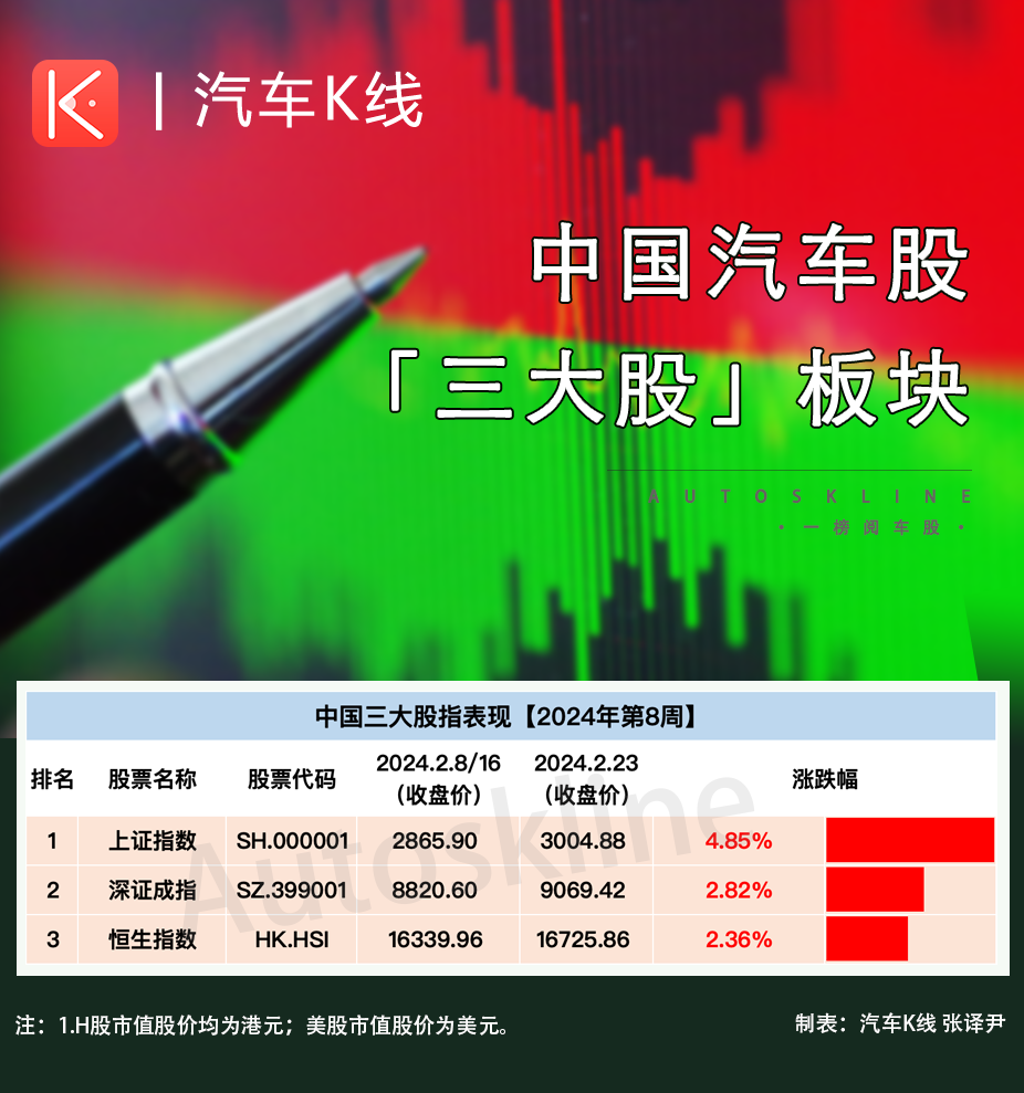 2024年第8周,汽车股整体表现继续向好,一周平均股价大涨5.35%,跑赢中国三大股指,总市值回升至5.65万亿元;