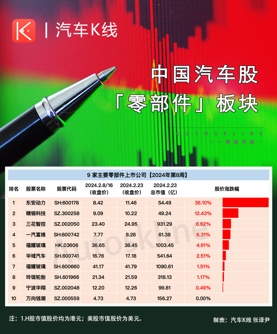 2024年第8周,零部件板块以万向钱潮持平与全线飘红“擦肩而过”,一周平均股价增长7.21%,总市值降至4,225.72亿元。