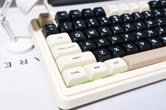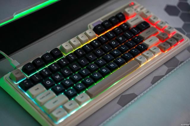 关于珂芝K75 Lite的背光,我个人觉得在这个价位上也是不错的,支持1600万色RGB,也内置了多种灯效,相对遗憾的就是键帽是实色的,所以灯光只能从按键下方溢出来,属于下灯位,光线不刺眼,能起到比较好的烘托气氛的效果,但确实不怎么亮哈,介意这个的朋友也不是没得选,可以加个几十块选择极昼的配色,这款键盘的按键侧面是半透的,可以展现更亮的背光。