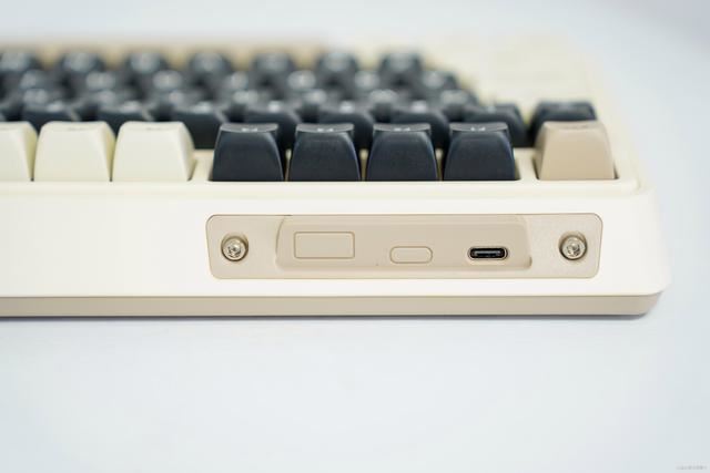 键盘外观部分最具特点的地方,就是位于头部最右侧的一个三模拨杆,分别有2.4G、蓝牙和关闭(即有线)模式三种可供选择。键盘背部设计简洁,除了四角的防滑硅胶垫,还有一个两段支撑脚,2.4G的接收器也有专门的收纳槽,不用的时候也不怕丢失。