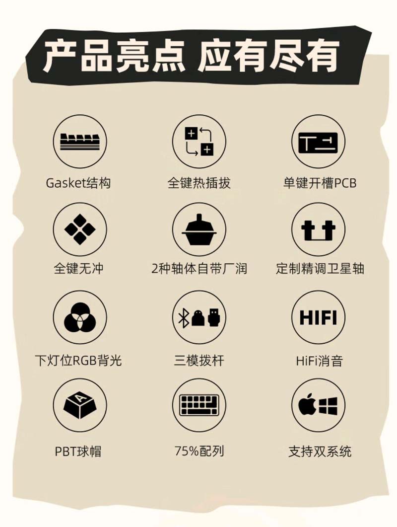 珂芝K75 Lite采用75配列,外观小巧,配色有多种选择且都是近两年流行的复古风,轴体也有两种选择,能适应不同的使用人群,最最重要的是,门槛够低,首发享平台补贴,最低179元到手,可以算得上性价比极高了。