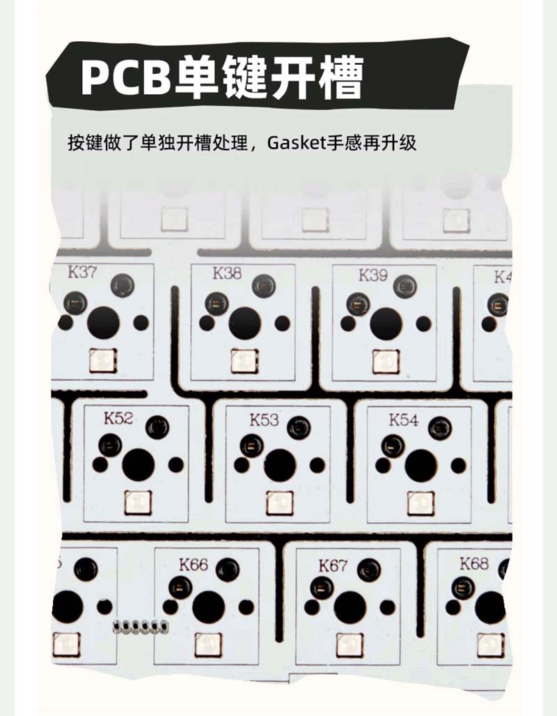 在底板的填充上,珂芝K75 Lite采用了Gasket结构,内置5层消音填充,单键开槽的PCB板上有底部消音硅胶垫、底部消音棉、PET膜、IXPE轴下垫和中板Poron棉,敲击时的声音可以说非常安静了,也完全没有空腔音,整体的听感有点像厚实的麻将声,听起来比较有精神,在寝室或办公室使用,不担心吵到别人。