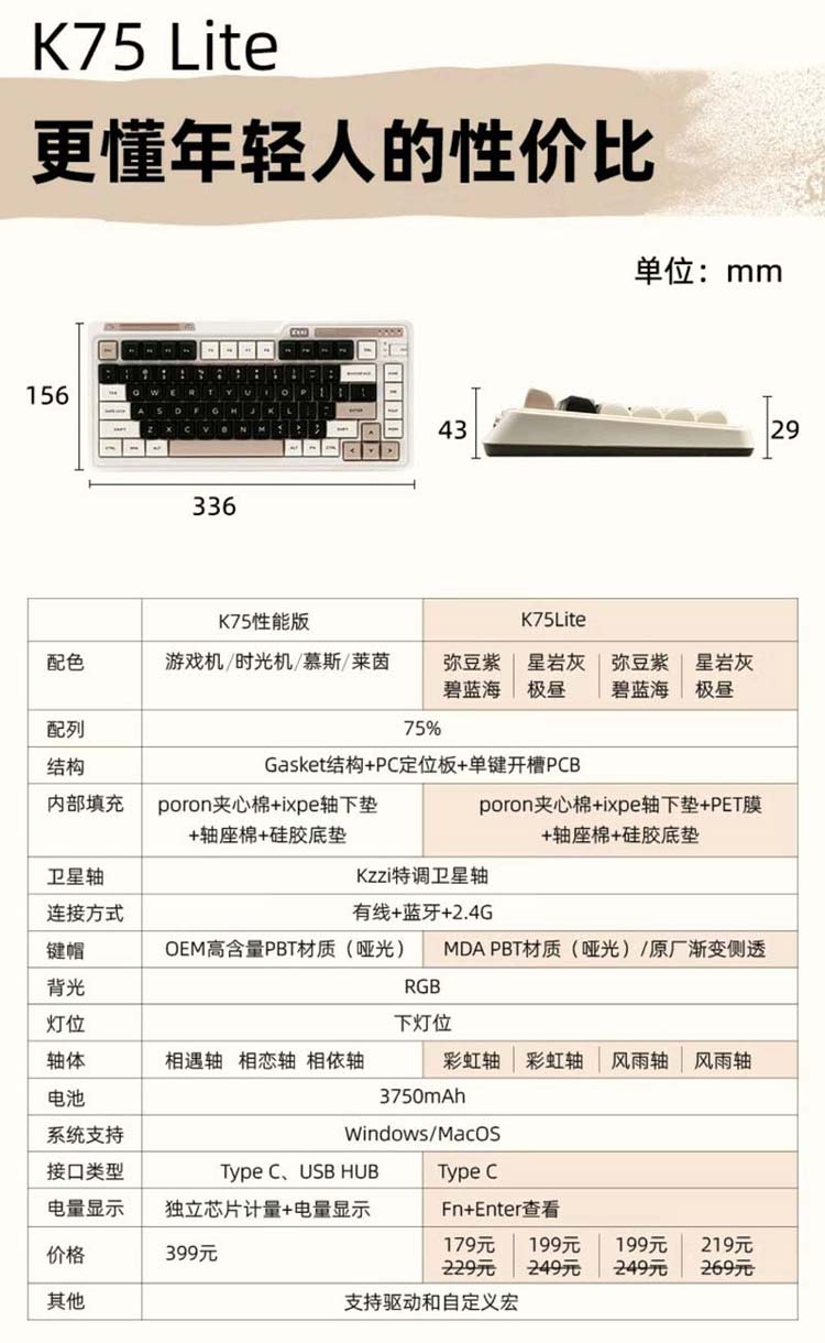 相较于原先的 K75 性能版键盘,K75 Lite 键盘取消了独立电量显示和 USB Hub 功能,并对内部填充和键帽进行了调整。该键盘可选彩虹轴和风雨轴两种轴体,弥豆子 / 碧海蓝配色定价 179 元起,星岩灰 / 极昼(侧刻)配色定价 199 元起。