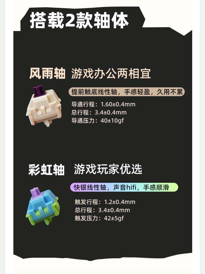 轴体方面我选择了提前触底线性轴——风雨轴,约5000次的敲击寿命,就算高强度使用也能用个四五年,品质方面很有保障。触发压力40gf左右,按上去比较省力,单端弹簧长度为22mm,回弹跟手。大键方面定制了精调的卫星轴,保证了和其他按键一致的手感。