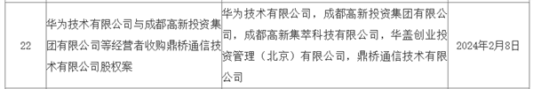 其中,包括华为技术有限公司与成都高新投资集团有限公司等经营者收购鼎桥通信技术有限公司股权案等。