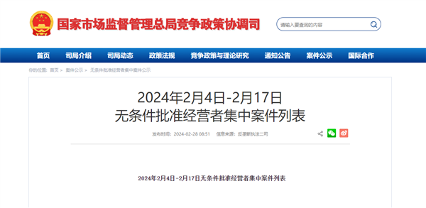 电脑知识网2月28日消息,今日,市场监管总局官网公布2024年2月4日-2月17日无条件批准经营者集中案件列表。